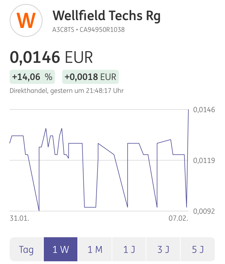 Heute gab es von Seiten Wellfield Neuigkeiten, denen ich aber keine große Bedeutung schenke. Nichtdestotrotz möchte ich kurz darüber informieren, denn "Early Warning News Release Regarding the..." hört sich ja beängstigend an. Levy Cohen, Geschäftsführer von Wellfield Technologies Inc., hat zusätzliche Aktien des Unternehmens erworben, wobei sein Gesamtanteil unter 10% bleibt, nachdem das Unternehmen weitere Stammaktien ausgegeben hatte (Verwässerung). Diese Information wurde als “Frühwarnmeldung” veröffentlicht, eine Routinebenachrichtigung für bedeutende Aktionäre. Trotz des alarmierenden Namens ist dies eine übliche Praxis und sollte keinen großen Einfluss auf die Aktionäre haben. Solche Mitteilungen können nützliche Einblicke in die Eigentumsverhältnisse eines Unternehmens bieten. Cohen hält seine Aktien zu Investitionszwecken und könnte in der Zukunft seine Beteiligung ändern.