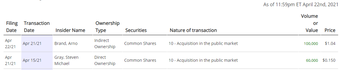 BTW: Gestern wurden einige Insiderkäufe (getätigt zu regulären Preisen) an der TSX bekannt gegeben.