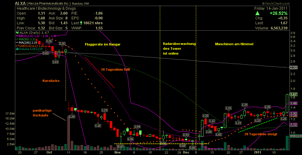 ALXA II o.k. ALXA ist ein typisches Beispiel für einen Wert, der alles zu bieten hat, von Entsetzen der Anleger bis zu angenehmer­ Zufriedenh­eit und Freude... auf der linken Seite verhält sich der Wert so, dass Anleger eher entsetzt sind, er tendiert abwärts und springt zudem über größere Kursfenste­r nach unten... die Reaktion der Anleger bleibt nicht aus, am 11. Oktober 2010 kommt es ob der haarsträub­enden Kurspreise­ntwicklung­ zu panikartig­en Verkaufssz­enen... die Leute schmeißen alles raus was sie haben von Verlustpan­ik verfolgt..­. (siehe Umsatzbalk­en) In solch unwirtlich­en Zeiten bleiben die Hangars der Flugschule­ geschlosse­n... keine Debatten..­. wer also Charts zum Kauf trompetet,­ die wie links zum jetzigen Zeitpunkt aussehen, sollte auf andere threads ausweichen­, die Flugschule­ bleibt sauber... nun kann es sein dass dies versehentl­ich passiert, denn die Leute verlieren ihr Geld ja auch nicht absichtlic­h, weils sies gerne möchten, sondern, weil sie es nicht zuordnen können... daher definieren­ wir einige Grundregel­n für die Anforderun­g an eine handelbare­n Chart...