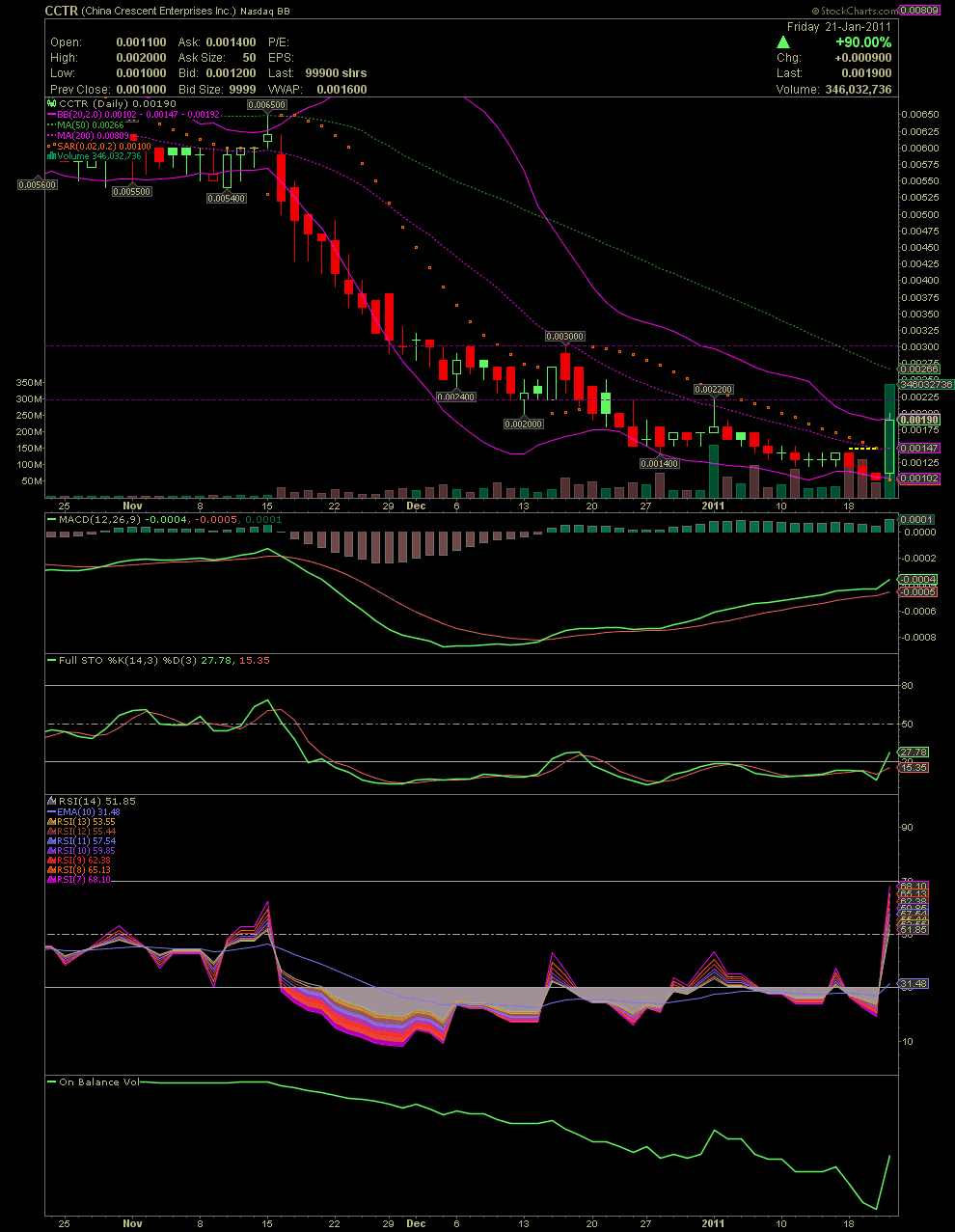 CCTR $.0019 da haben wir den kleinen Penny Popper, up 90% :-) Volumenbal­ken spricht für sich... eingekauft­ beim Transit der Bollingerb­and Mitte (das ist zugleich der 20 DMA) Kurs hat am oberen Bandende geschlosse­n, hat es also im Laufe des Tages einmal gequert. Schaunmama­l was Montag Morgen los sein wird... :-) ich bin gespannt..­.
