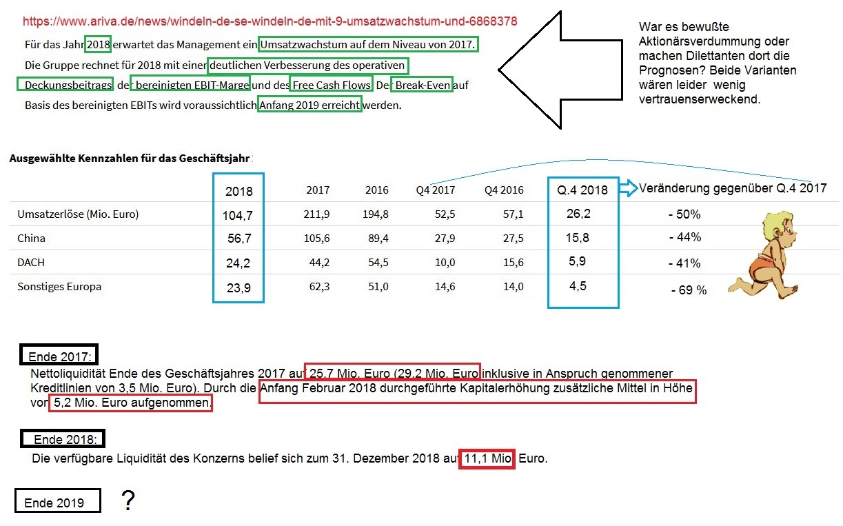 Wer mitdenkt, der läßt sich nicht so leicht einlullen von der Meldung heute mit dem reinen Umsatzvergleich Q.3/18 und Q.4/18 in China. Rein saisonal gesehen ist Q.3 ja regelmäßig schwächer und somit ein höherer Umsatz in Q.4 gegenüber dem direkten Vorquartal nichts besonderes. Besser ist es natürlich man nimmt als richtige Vergleichsreferenz das Q.4 des Vorjahres. Und da sieht man, daß in China in Q.4 2018 gegenüber dem Q.4 2017 der Umsatz um ca. 44% eingebrochen ist ( q4/18 mit nurnoch 15,8 Mio gegenüber q4/17 mit 27,9 Mio). Also "tolle Erholung in China" kann man da wirklich nicht sehen im relevanten Jahresvergleich. Da müßte man schon rosabebrillt sein, um sich das schönzureden. Und Q.4 2017 war jetzt zuvor auch nicht das große Ausnahmequartal nach oben gewesen. Denn auch in 2016 hatte man in Q.4 doch in China ähnliche Umsätze wie in Q.4 2017. (q4/16 27,5Mio vs. q4/17 27,9Mio ). Von daher also weiter dramatische Veränderungen, nicht nur bei den Umsätzen in Europa, sondern eben auch in China. Wenn man mal den Cashburn in Relation setzt zum extrem eingebrochenen Restumsatz, dann ist die Relation Verlust pro 1€ Umsatz weiterhin brutal. Also ob die Geldgeber sich bei der jetzt anstehenden KE wirklich einen Gefallen tun wird die Zeit zeigen müssen. Alternative wäre ja wohl sonst gewesen den Laden in 2019 abzuwickeln, da man mit dem Restgeld nicht mehr lange über die Runden gekommen wäre.