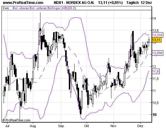 Der kurzfristige Chart zeigt nicht hundertprozentig die Bedeutung der Chartzone, an die die Aktie von Nordex derzeit heranklettert. Das Papier beendete den Dienstagshandel bei 13,11 Euro. Knapp hierüber beginnt eine wichtige Widerstandszone, die von 13,37 Euro bis auf 14,23 Euro reicht. Wird diese Zone überwunden, wäre eine monatelange Konsolidierungsbewegung beendet und eine bullishe Ausgangslage geschaffen. Im günstigen Fall könnte das Papier aus charttechnischer Sicht dann sogar den Bereich von 23,10 Euro wieder erreichen.