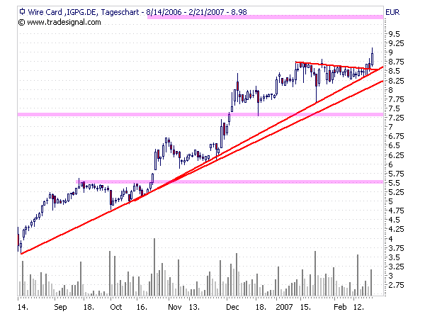 Rückblick: Die WIRE CARD Aktie (Nachrichten/Aktienkurs) erreichte Anfang Dezember ein Hoch bei 8,45 Euro. Seitdem pendelt die Aktie um dieses Hoch. In der laufenden Woche setzt sich die Aktie erstmals deutlicher nach oben ab. Bei 9,47 Euro liegt aktuell die langfristige Pullbacklinie. Allerdings ist sie bisher nicht sonderlich stark definiert. Daher gibt es durchaus eine Chance auf einen Durchbruch.