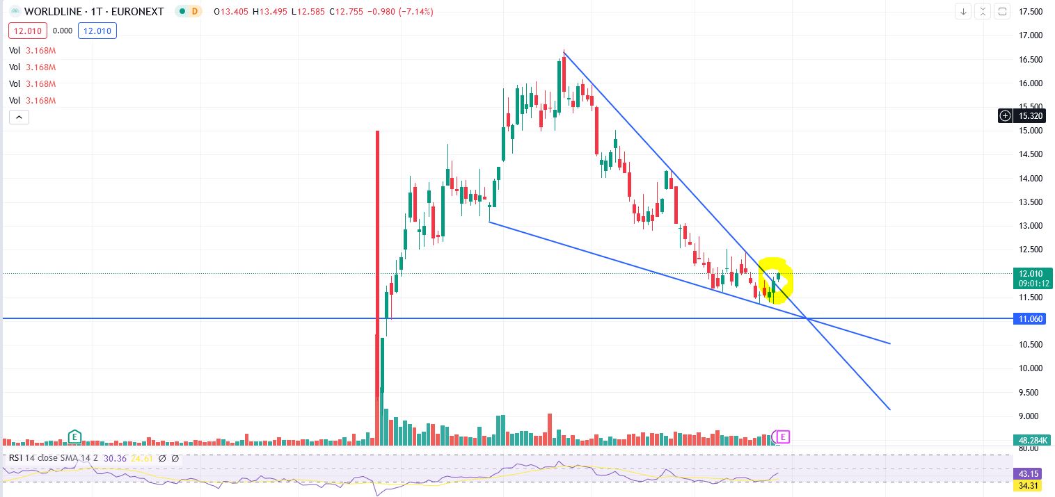 Die Reaktionen auf diese minimalen Umsatzrückgänge sind total übertrieben. Das Unternehmen ist nach wie vor profitabel, man muss aber sehen, dass dies keine Visa, Mastercard oder sowas ist. Das Geschäftsmodell von Worldline ist deutlich Personalintentsiver und auch Kapitalintensiver (Ich sehe hier kaum 20% Kapitalrendite). Und die habe einfach zuviele Leute eingestellt weil sie mit mehr Wachstum gerechnet hatten. Wenn die Personalquote wieder im Einklang mit dem Umsatz ist werden auch wieder 400Mio+ Gewinne und Free-Cashflows erzielt. Das wären 1,5€ pro Aktie. Vermutlich werden Sie sogar wieder 550Mio Gewinn schaffen und somit 2€ pro Aktie.