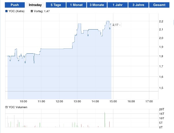 Typische abzocken Fall. Tages Hohe:2.45 und Tagestief 1,61. Riesiger Große unterschied. So kann aber YOC immer tief bleiben.............