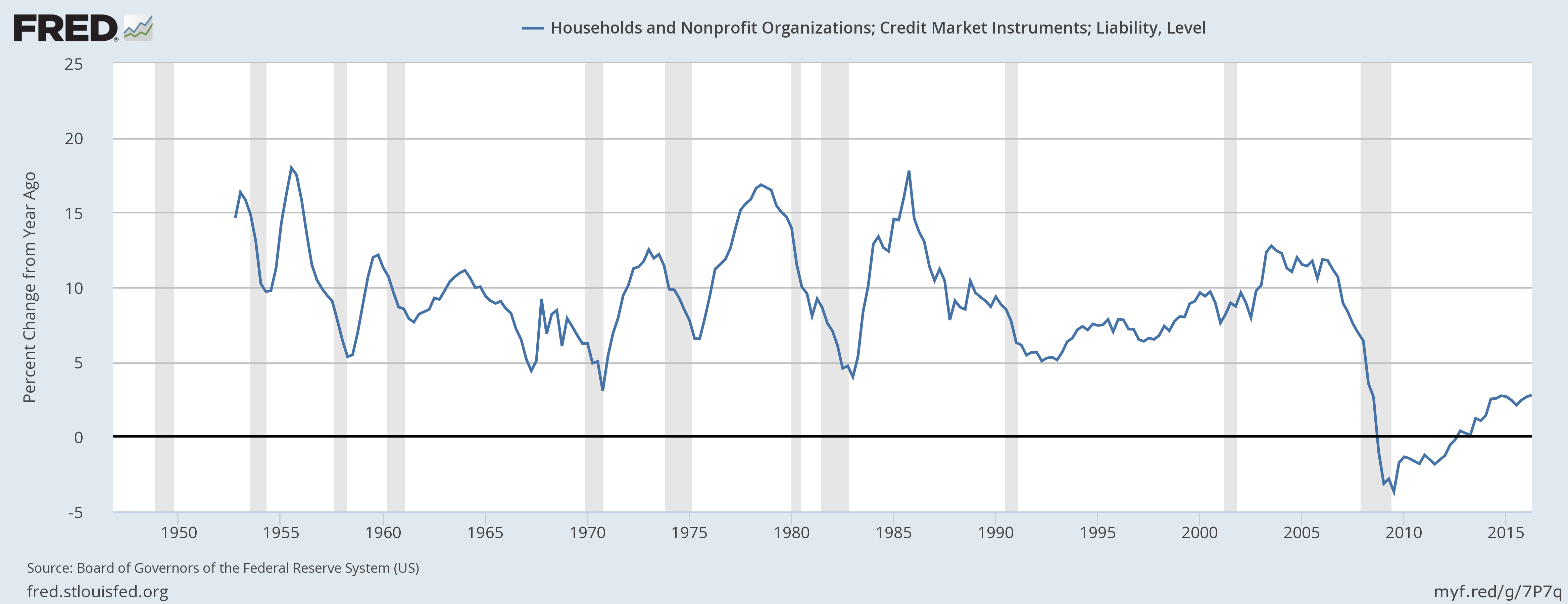 The current environment is worrisome because we’re still climbing out of a very deep economic hole. The foreign sector is still acting as a drag on growth and the deficit has declined sharply as the private sector has recovered. But the private sector is still weak. In fact, household debt growth is still at levels consistent with past recessionary periods: