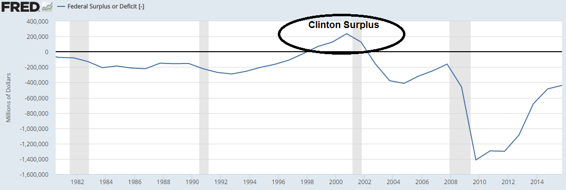 ...Hillary Clinton will be a one term President. The reason I say this is because I suspect that her economic plan will not be very stimulative and I think that four more years of weak economic growth will be intolerable. And the main driver of my thinking here is deeply rooted in Bill Clinton’s presidency. Back in the late 90’s the US government ran a brief budget surplus. It was heralded as an act of “fiscal responsibility” at the time. Of course, when the economy tanked immediately following the surplus the government was driven back in the red as tax receipts cratered and automatic spending jumped.