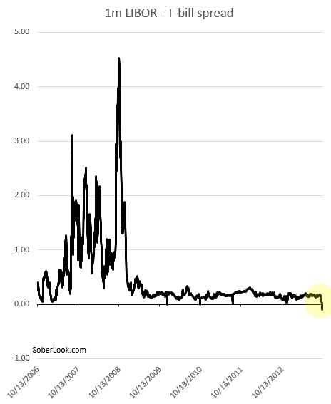 1m Libor / 1m T-Bill Spread .. ist negative for the first time in history =  US government­ credit is worse than bank credit...