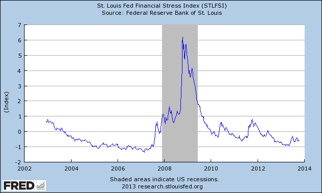 The STLFSI measures the degree of financial stress in the markets and is constructed from 18 weekly data series: seven interest rate series, six yield spreads and five other indicators. Each of these variables captures some aspect of financial stress. Accordingly, as the level of financial stress in the economy changes, the data series are likely to move together. The latest STLFSI press release, with commentary, can be found at http://www.stlouisfed.org/newsroom/financial-stress-index/