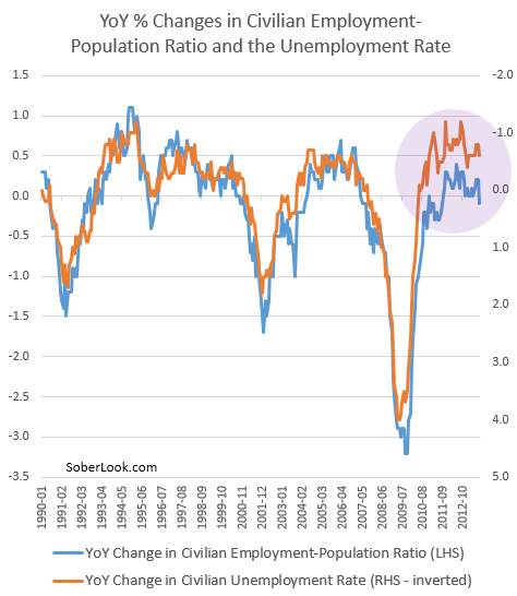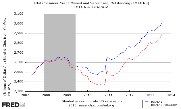 Die US tendieren seit 2011 zur Austerität, Ausgaben und Staatssektor schrumpfen. Man sieht, das private investment / Consuming eine immer grössere Lücke stemmen muss, um allein den Status Quo zu halten. Ein bearishes Argument insofern, als dies postrecessiv nur über verstärkte Kreditaufnahme möglich wird, während gleichzeitig durch die Reduzierung der staatlich fundierten Nachfrage die Earnings unter Druck geraten. Steigende Zinsen aufgrund steigender Verschuldung der Privaten + sinkende Earnings bei bullishem Forecasting + 'diesmal ist anders, weil QE endlos' Narrativ ist aus AZ-Sicht ein idealer Mix für den kommenden Bärenmarkt...