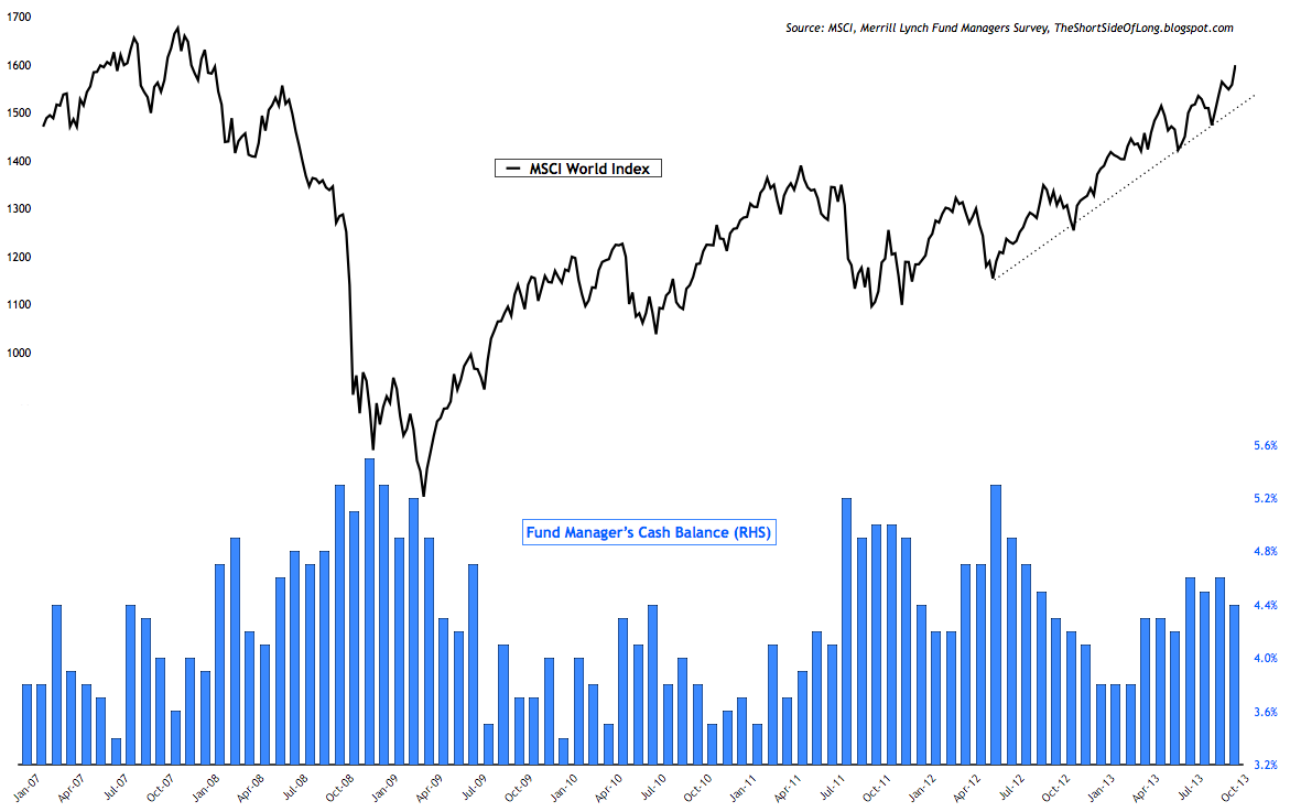 When we look at the overall exposure to various asset classes, we can conclude that fund managers around the world really favour Developed Market stocks and dislike emerging markets, commodities and bonds. Therefore, one way we can explain above average cash levels is due to the fact that just about every asset class apart from DM stocks is currently under performing. While managers are making money in one area of their portfolio, other areas are declining and forcing them reduce exposure and rise cash.