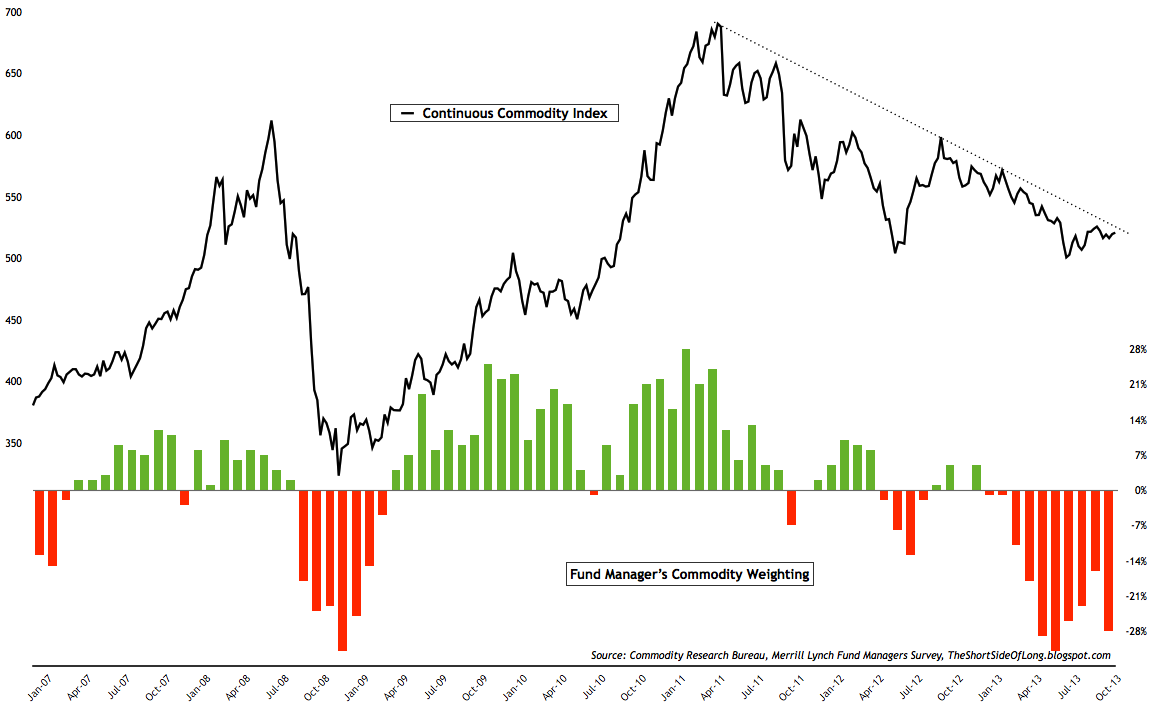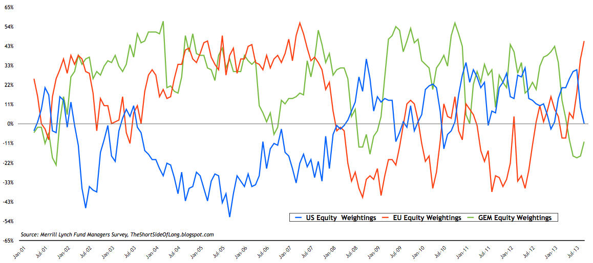 Regional exposure within the stocks is also changing. Eurozone equites are now the most favour area for global fund managers, being 46% overweight. This is a huge increase from only 3% overweight in July of this year. Japanese equities come in as the second most loved region in the survey, at 30% overweight. Interestingly, US equities, which have been favoured so many times since the 2009 bull market began, currently find themselves at neutral levels (0% exposure). It seems that trend followers and sheep herding managers have been scared by the Debt Ceiling issues and have rotated out of US into EU.