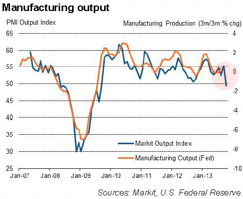 Markit: The flash PMI provides the first insight into how business fared against the backdrop of the government shutdown in October, and suggests that the disruptions and uncertainty caused by the crisis hit companies hard. The survey showed the first fall in manufacturing output since the height of the global financial crisis back in September 2009.