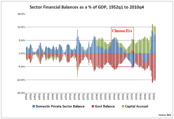 Im Normalfall korreliert die Gov Balance negativ mit der Privat Sector Balance - so spiegelt ein Budget Deficit ein entsprechendes Surplus der Privaten. Unter Clinton wurde der Spiess umgedreht: Der Staat sparte, die Einkommen sanken und die Haushalte begannen ihre Verschuldungsorgie, welche erst mit der Liquiditätsverknappung durch die Fed 07 ihr rabiates Ende fand. Insofern gibt es einen logischen Link zwischen den Haushaltsüberschüssen Clintons und der dramatischen Neuverschuldung unter Bush / Obama...