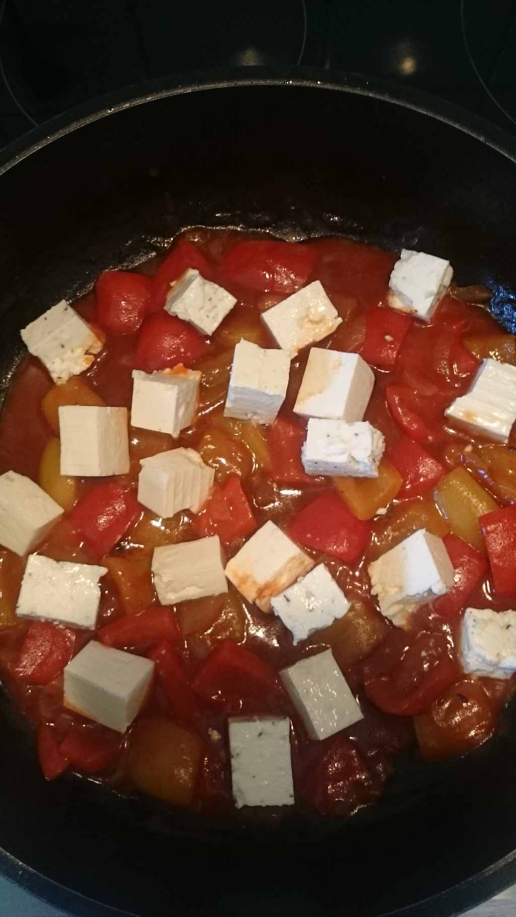 kurz anbraten, dann köcheln. Zum Schluss Fetakäsewürfel