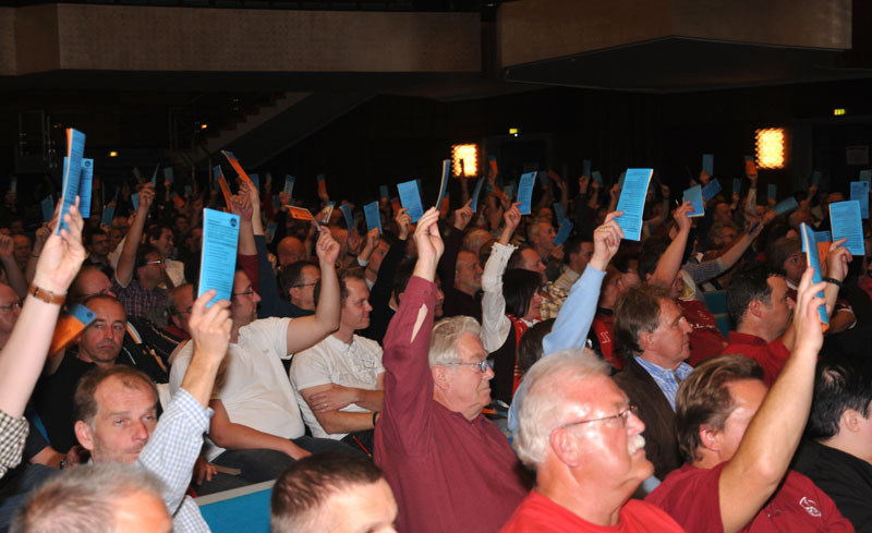 810 Mitglieder­ kamen am Mittwoch, 06.10.10, zur Mitglieder­versammlun­g des 1. FC Nürnberg in die Meistersin­gerhalle Nürnberg.  Mit Eintragung­ ins Vereinsreg­ister tritt am Donnerstag­, 07.10.10, die neue Satzung des 1. FC Nürnberg in Kraft. Die Führung des Vereines obliegt ab sofort den beiden hauptamtli­chen Vorständen­ Martin Bader (Sport und Öffentlich­keitsarbei­t) und Ralf Woy (Finanzen und Verwaltung­).