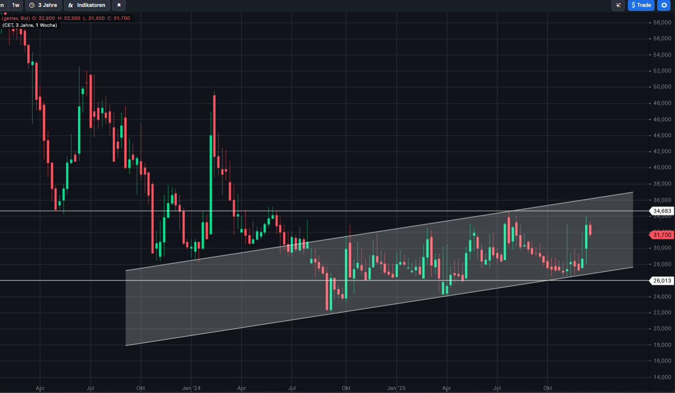 Die untere Begrenzung des intakten Trendkanals liegt bei ca. 26 Euro. Und ich habe geschrieben, dass diese vielleicht getestet wird. Ob der Kurs an dieser Stelle wieder nach oben dreht oder der Trendkanal nach unten verlassen wird, das kann man nicht sagen. Es könnte ein guter Einstiegszeitpunkt sein oder aber nicht. Es entscheidet jeder selbst, wie er darauf reagiert bzw. was er daraus für sich ableitet.