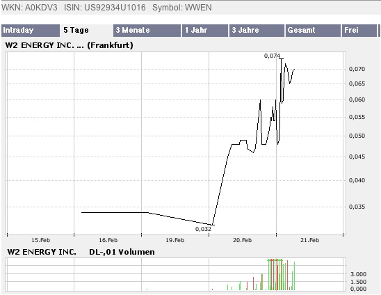 (...)Eines dieser Unternehmen, das nach unserer Einschätzung überproportional vom Zukunftsmarkt regenerative Energien profitieren sollte, ist das US-Unternehmen W2 Energy Inc. (WKN: A0KDV3 ), das mit der Entwicklung von Technologien für den Bereich erneuerbare Energien(...)"