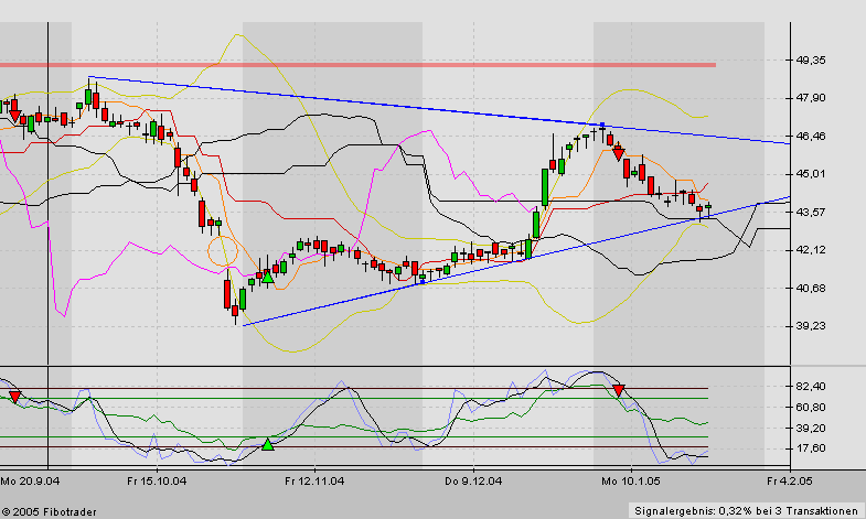Negativ ist aber, daß die langfristi­ge Abwärtstre­ndlinie wieder nach unten gebrochen wurde und jetzt mit der Aufwärtstr­endlinie ein Dreieck ausbildet.­