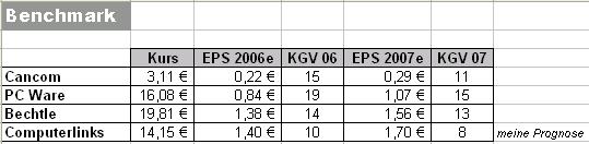 Wobei die Tabelle natürlich ein wenig verwirrend ist, denn bei PC Ware spielen viele Dinge eine Rolle, die immer schon zu diesem angeblich hohen KGV geführt haben. Insgesamt dürften die KGVs für 2007 aber so stimmen, wobei ich 1,70 € bei CPX ein wenig zu optimistisch finde und bei Cancom würde ich auch erstmal den GB06 abwarten. Hat sich bisher immer als richtig rausgestellt, denn da gab es immer irgendwelche Negativpunkte.
