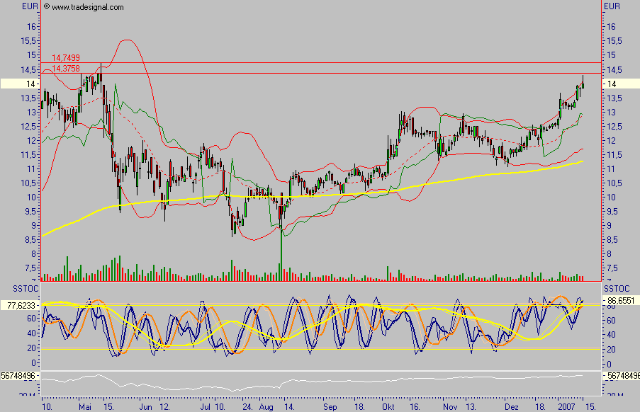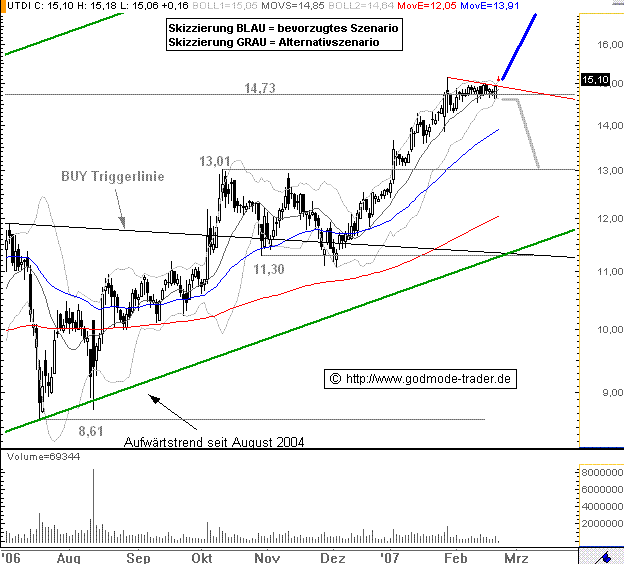 Rückblick: Die UNITED INTERNET Aktie erreichte am 12.05.2006 ein Allzeithoch bei 14,73 Euro Nach einer Korrektur bis 8,61 Euro durchbrach die Aktie am 09.10.2006 endgültig eine wichtige BUY Triggerlinie im Bereich um 11,65 Euro und zog danach erwartungsgemäß an. Am 26.01.2007 erreichte die Aktie das Hoch aus 2006. Seitdem pendelt die Aktie um dieses Hoch, wobei sie heute einen kurzfristigen Abwärtstrend überspringt. Dabei reißt sie ein kleines Aufwärtsgap zwischen 14,94 und 15,06 Euro. Der kurzfristige Abwärtstrend liegt heute bei 14,93 Euro.