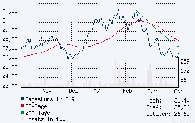 Kann der Kurs aus seiner Position vom Freitag nach oben drehen, so könnte er wieder über 3.000 Yen steigen und dabei die Trendlinie als Etappenziel für seinen Aufstieg verwenden. Dreht er jedoch nach unten, so unterschreitet er den 200-Tage-Durchschnitt. In diesem Fall liegt die nächste Unterstützung bei 2.480 Yen. Mit einem solchen Rücksetzer würden die Kursgewinne dieses Jahres wieder komplett abgegeben.