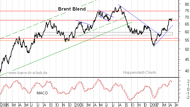 Angesichts des saisonalen Kursmusters (Sommermonate) ist mittelfristig eher ein schleppender Kursverlauf realistisch. Die nächste Chartmarke bei 75 Dollar pro Barrel bleibt aber erreichbar.