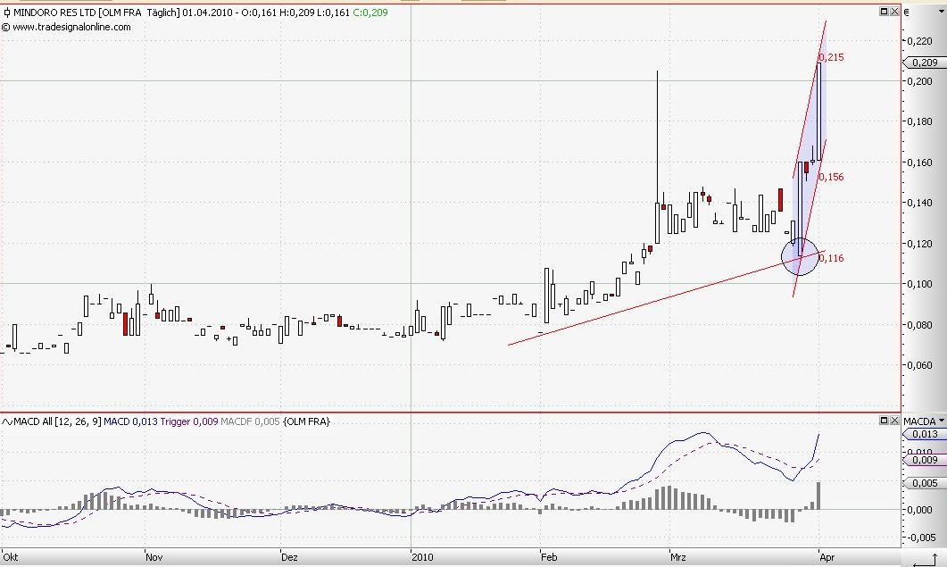 In den Staaten wurde Mindoro mit 33000Stück gehandelt, nur Käufe. Dabei wurde der letzte Kurs bei 0,318$US festgesetzt. Nach dem letzten Wechselkurs EUR/US-Dollar mit 1,3483, von Ariva, ist der Kurs in EUR nachbörslich auf 0,2358EUR angestiegen. Der letzte Kurs aus Deutschland war 0,209EUR in Frankfurt. Morgen wird der Kurs mit einem positiven Gap von 0,0268EUR eröffnen. Es scheint so als wäre man auf Mindoro aufmerksam geworden!