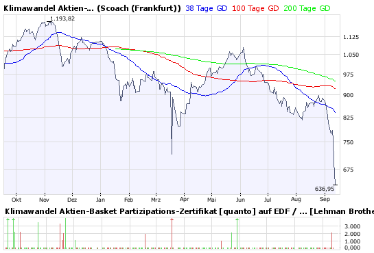 Und wenn uns unsere CHARTING-Engine, die ja hier und da noch fehlerhaft ist, in diesem Falle nicht anschmiert, so gab es in dem LEHMAN-Basket mit dem klangvollen Namen "Klimawandel" schon am vergangenen FREITAG (12.9.2008) gar kein OPEN, HIGH und auch kein LOW mehr, sondern nur noch einen CLOSE-Kurs...