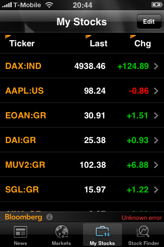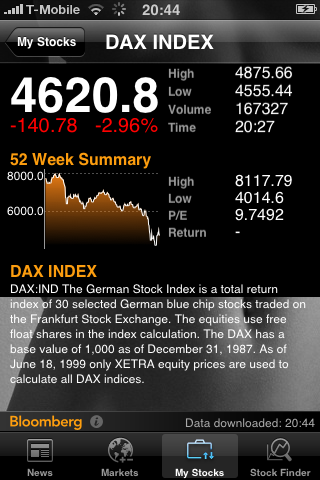 Die Bloomberg iPhone App bringt aktuelle Nachrichten im Kompaktformat auf das hochauflösende iPhone-Display. Neben den Entwicklungen aller wichtigen Börsenindizes mit den dazugehörenden Werten liefert die Bloomberg App einzelne Kurse mit Entwicklung und Empfehlungen auf das Handy. Aktuelle Meldungen zu den jeweiligen Unternehmen runden die Informationen ab.