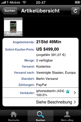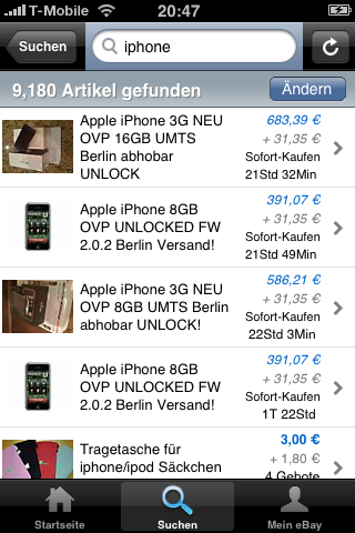 Auf der Keynote-Präsentation anlässlich der Apple World Wide Developer Conference 2008 wurde die Anwendung, die eBay für das iPhone entwickelt, bereits vorgeführt. Mit der typischen Touchscreenbedienung des iPhones kann man mit dem Finger durch Angebote und auch deren Fotos blättern. Eine eingebauten E-Mail-Funktion erlaubt, Käufern sofort zu antworten. Man kann seine eigenen Angebote beobachten und auch die, auf die man bietet. Natürlich ist auch die mobile Gebotsabgabe möglich. Die Software soll kostenlos zur Verfügung gestellt werden, sobald der AppStore von Apple am 11. Juli online geht.