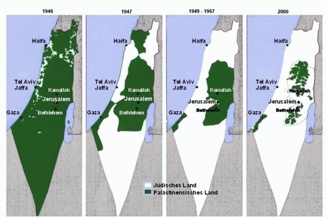 palästinänsern schwer ein eigenen staatsgebilde aufzubauen, weil jedes jahr das eigene land zusammenschrumpft oder neue grenzen von fremden gezogen werden.