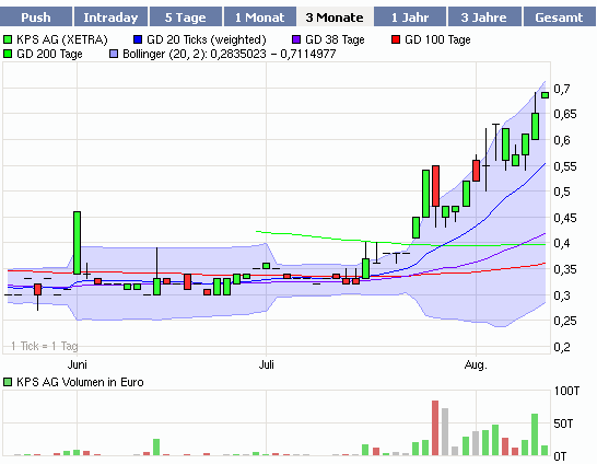 Um neun Prozent zieht der Aktienkurs des Münchner Beratungsunternehmens KPS an und nimmt somit wieder Fahrt auf. Nachdem der Titel sich in der Zeit zwischen dem 17. Juli und dem 12. August in der Spitze bereits um fast 160 Prozent auf 0,80 Euro verteuert hatte, setzte eine Korrektur ein, die Mitte des Monats bis auf 0,48 Euro führte. Nun hat die KPS-Aktie aber wieder die Richtung gedreht und zieht gen Norden.