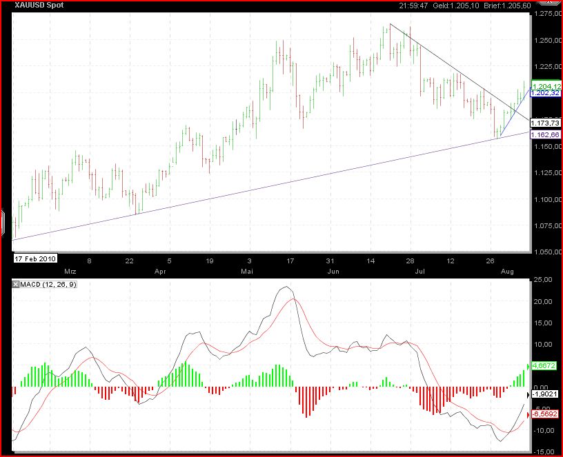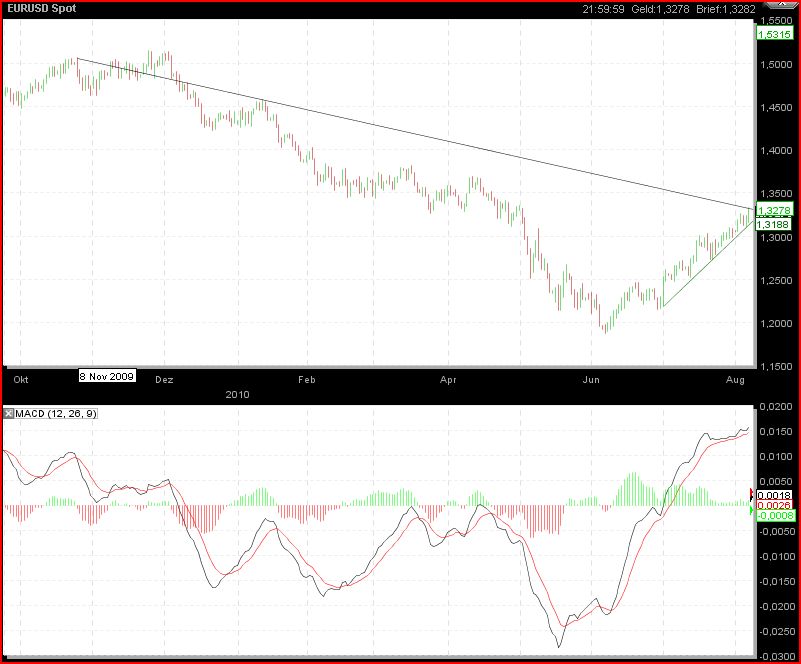 Ich glaube, dass niemand den Double Dip in den USA will....daher wird der Usd aufgeweicht und der Euro gestärkt, jedenfalls kurzfristig. Man merkt das an der Nachrichtenlage... Europa wird nur von Deutschland gezogen und das wird den Medien dann auch irgendwann auffallen. Spätestens wenn es den ersten Dämpfer im deutschen Export durch den hohen Euro gibt - vielleich im Sept.