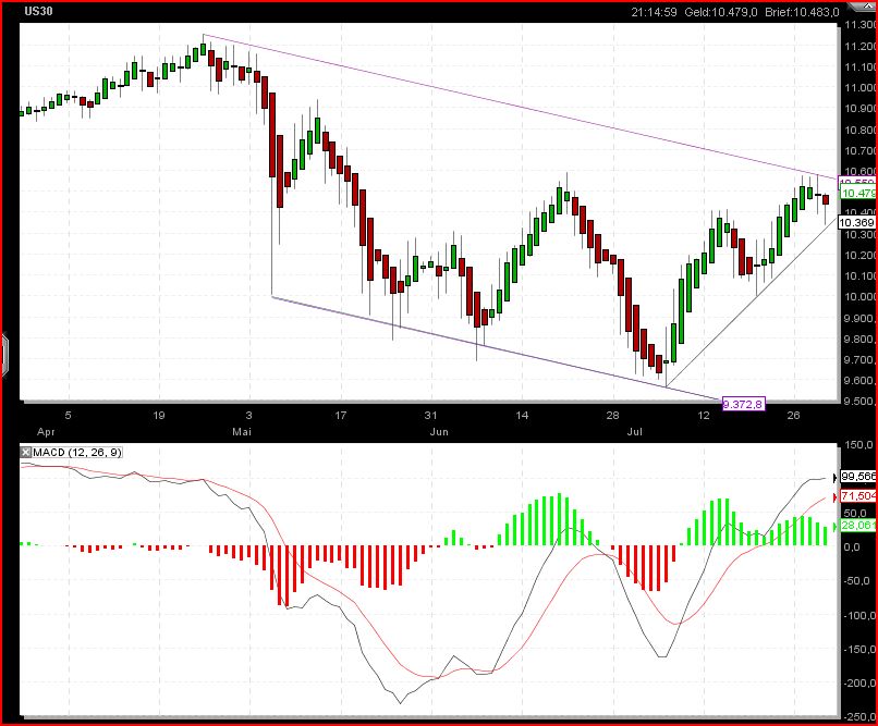 Fangen wir mal mit dem Dow an, erste Anzeichen einer Konsolidierung auf recht hohem Niveau, leider gestern gegen Handelsschluß etwas zunichte gemacht und meine Shortposi seit 10486 ist in die Verlustzohne gerutscht, nachdem ich den ganzen Nachmittag moderat im Plus war.