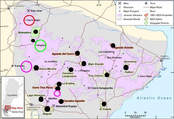 - Cerro Vanguardia mine (AngloGold Ashanti and Formicruz, 7Moz Au and 104Moz Ag reserves plus historic production);