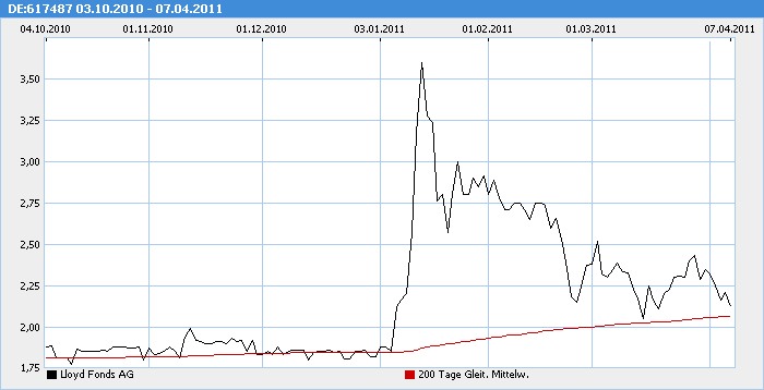 Ja, du hast recht, durch die relativ geringe Liquidität der Lloyd Fond AG Aktie kam es im Januar diesen Jahres bei stark steigender Nachfrage zu einer überschießenden Reaktion des Aktienkurses bis auf ein kurzweiliges Hoch bei ca. 3.60 €.