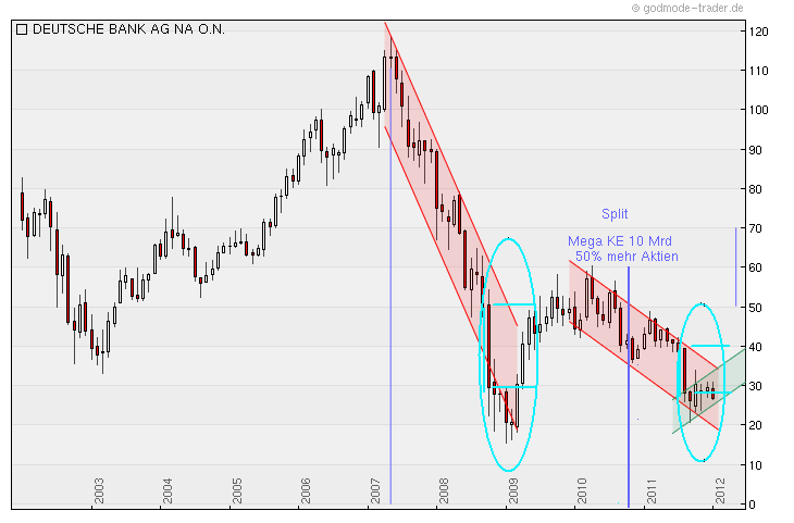 Da ich alle Kurse dieser Werte bei historischer Betrachtung als maßlos unterbewertet betrachte und eine Rendite von mindestens 10% p.a. anstrebe, mit 15% p.a. rechne habe ich die beiden Dividentitel gewählt, da sie auf lange Sicht von den momentanen Kursen über 6% Dividende p.a. bringen werden. Die Deutsche Bank fällt hier etwas aus dem Rahmen, ist aber dermassen unterbewertet, wegen der Panik um den Euro mehr als nachvollziehbar.