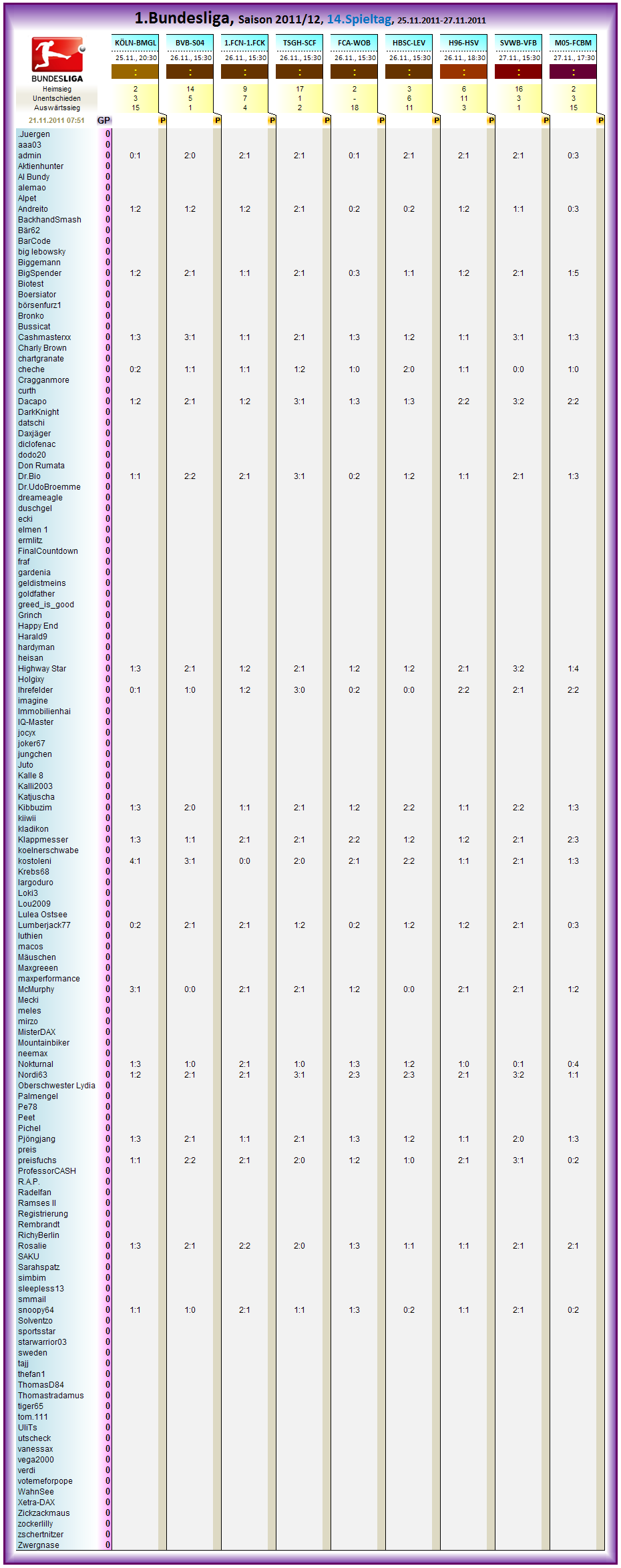Gespielt wird der Spieltag vom 25.11.2011 20:30 - 27.11.2011 17:30..