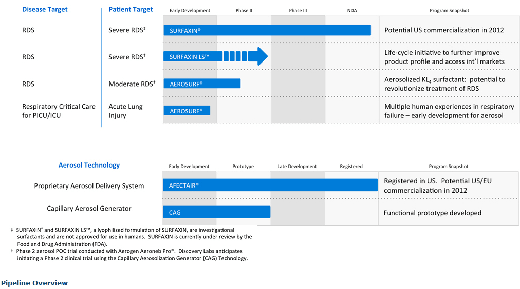 During Surfaxin’s Phase 3 clinical trials, a leading academic neonatologist assessed the biological activity of the clinical batches by measuring respiratory compliance in a well-established pre-term lamb model of RDS. After completing Surfaxin’s Phase 3 clinical trials, in accordance with discussions with the FDA, Discovery Labs validated and implemented the BAT as a recurring quality control test to confirm biological activity for Surfaxin release and stability testing. Based on agreements reached in meetings with the FDA in 2006 and 2008, Discovery Labs conducted a series of preclinical experiments to establish comparability between Surfaxin drug product used in Phase 3 clinical trials and the Surfaxin drug product intended to be manufactured for commercial use. Accordingly, Discovery Labs initiated a series of side-by-side studies employing both the pre-term lamb model of RDS and the BAT and believes that the correlated results demonstrate comparability and support approval of Surfaxin.
