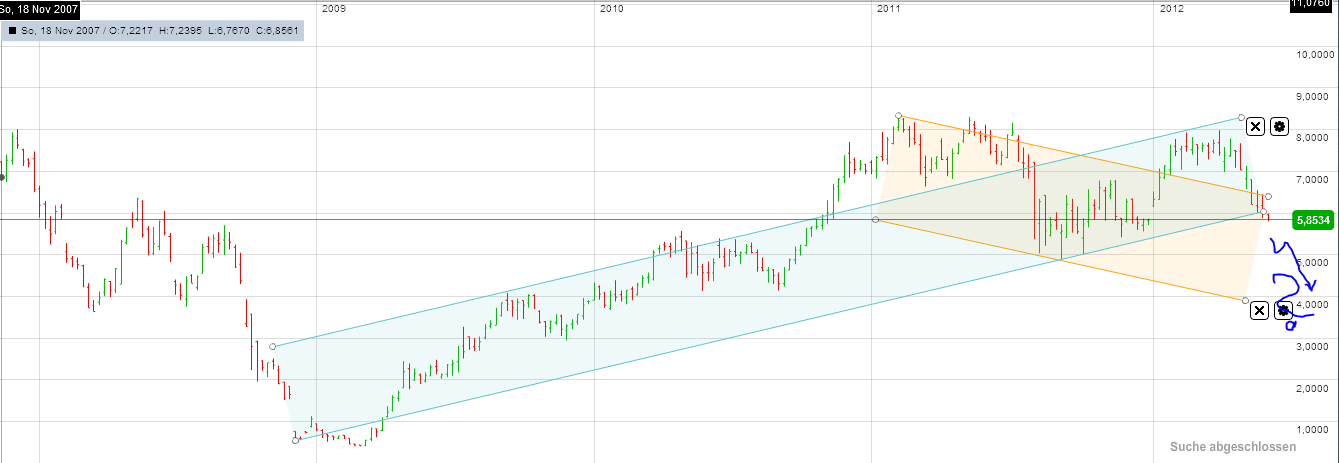 sieht ja irgendwie überhaupt nicht mehr so rosig aus....Trendkanal beginnend Dezember 2008...also der der die Bullen nun seit 3 Jahren begleitet und ordentlich Gewinne gebracht hat....ist nachhaltig durchbrochen.....für den neuen gibt es bis jetzt in südlicher Richtung noch keine Bestätigungspunkte somit noch reine Spekulation...aber irgendwo dort wird die Reise wohl hingehen....