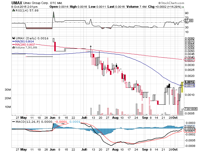 Nachbörslich NEWS für UMAX. Was habe ich gesagt. Wenn l2 hunter für einen penny wert ein Kursziel von $05 raus gibt und mit einer Welle von news rechnet dann weiß er mal wieder mehr als der Rest. Wie schon bei GEQU. Auch da hat er einen call bei 0012 raus gegeben mit $05 Kursziel und das wurde erreicht. Ich gehe davon aus das UMAX die nächsten Wochen ebenfalls die $05 erreicht.
