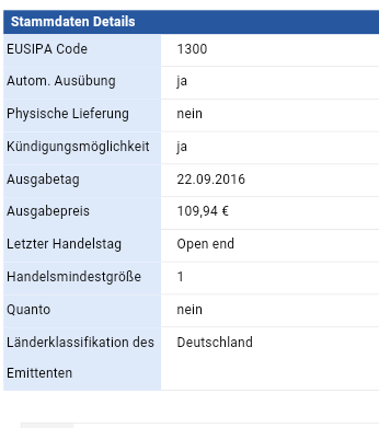 Das Zertifikat ist seitdem 22.09.2016 handelbar mit einem Ausgabekurs von 109,94 Euro.