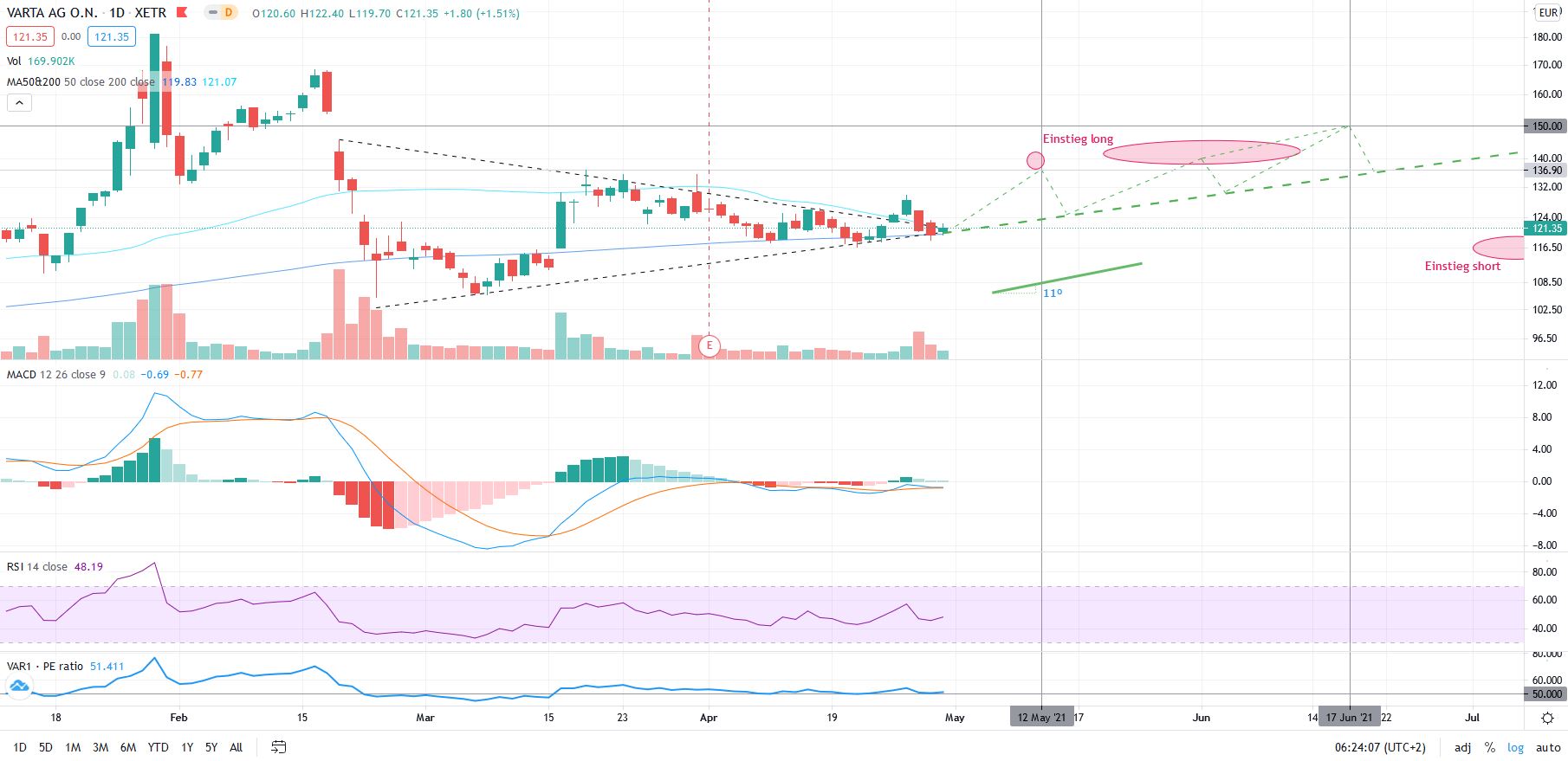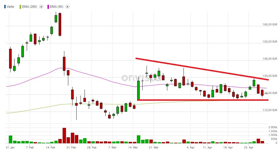 Varta ist jetzt am Scheidepunkt, man kann kein Szenario vorhersagen, das eine höhere Wahrscheinlichkeit hat als 50%. Schade - denn absteigende Dreiecke haben häufig eine gute Voraussetzung, wirken hier aber nur subsidiär.