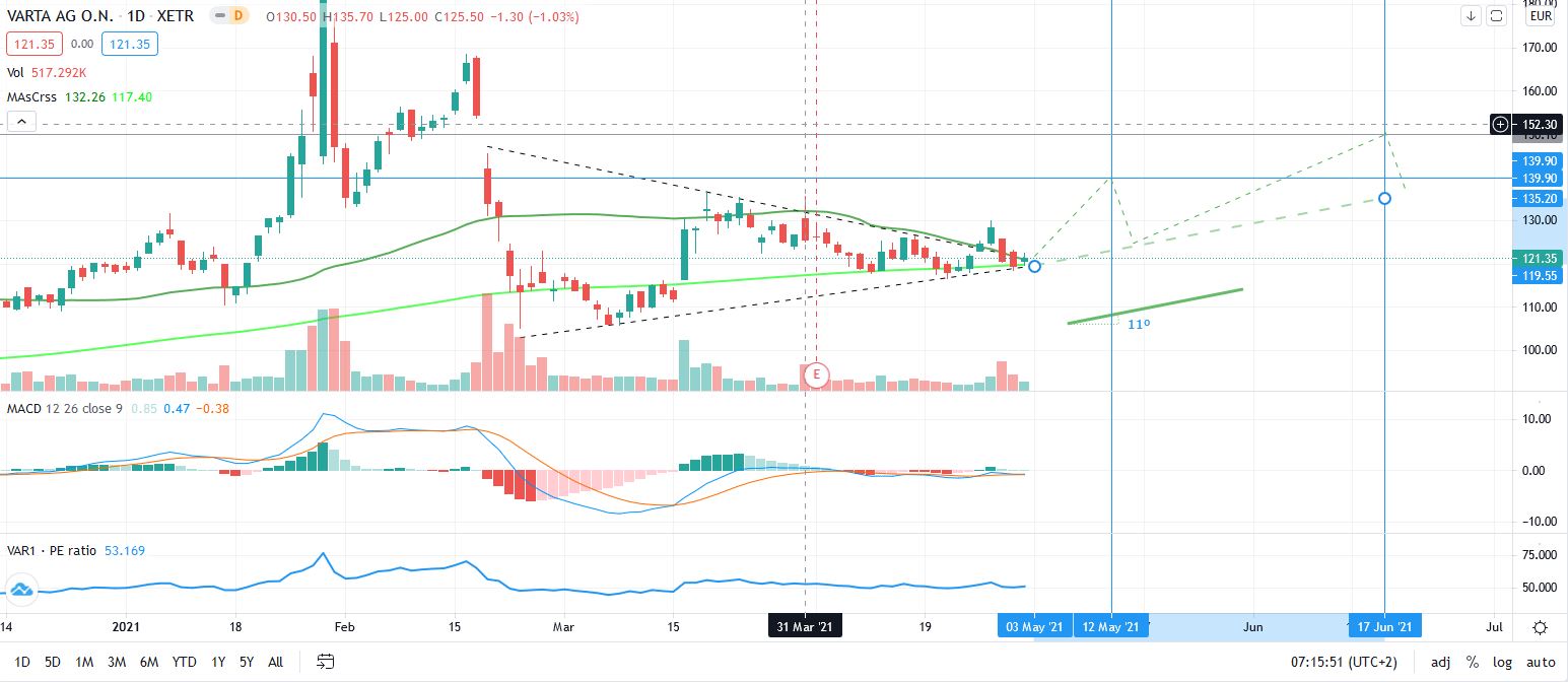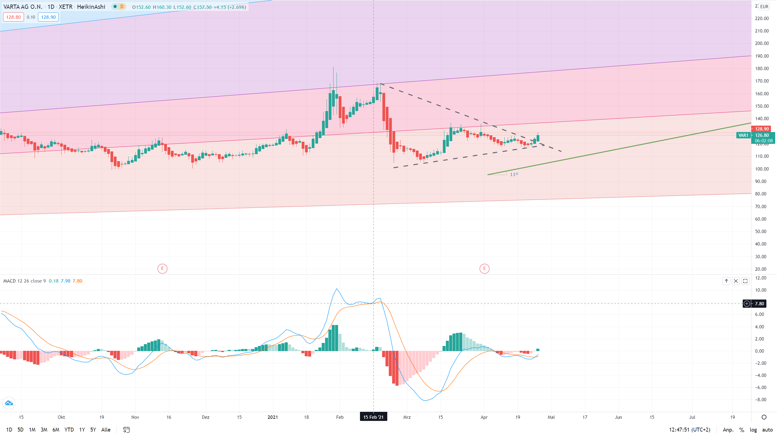 Sollte der DAX nicht nachgeben, so könnte Varta das auch in einem positiven Umfeld vorher erreichen. Anhand der MACD kann man sehen, dass Varta dem deutschen Markt schon wieder hinterhereilt.