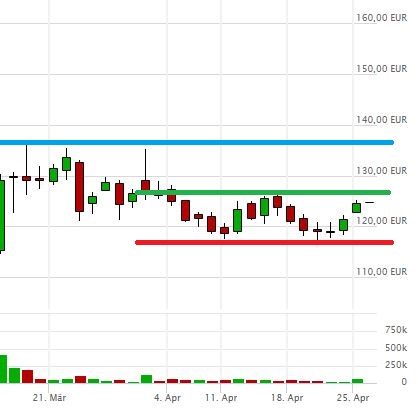 Angepasst an die letzten Tage habe ich mal versucht die Linien in das Chart zu ziehen (welche Software nutzt ihr?) und daraus folgend müsste für ein positives Signal der Tagesschlusskurs über 130 liegen und ein negatives Signal unter 117, der GD50 liegt jetzt bei knapp unter 124.
