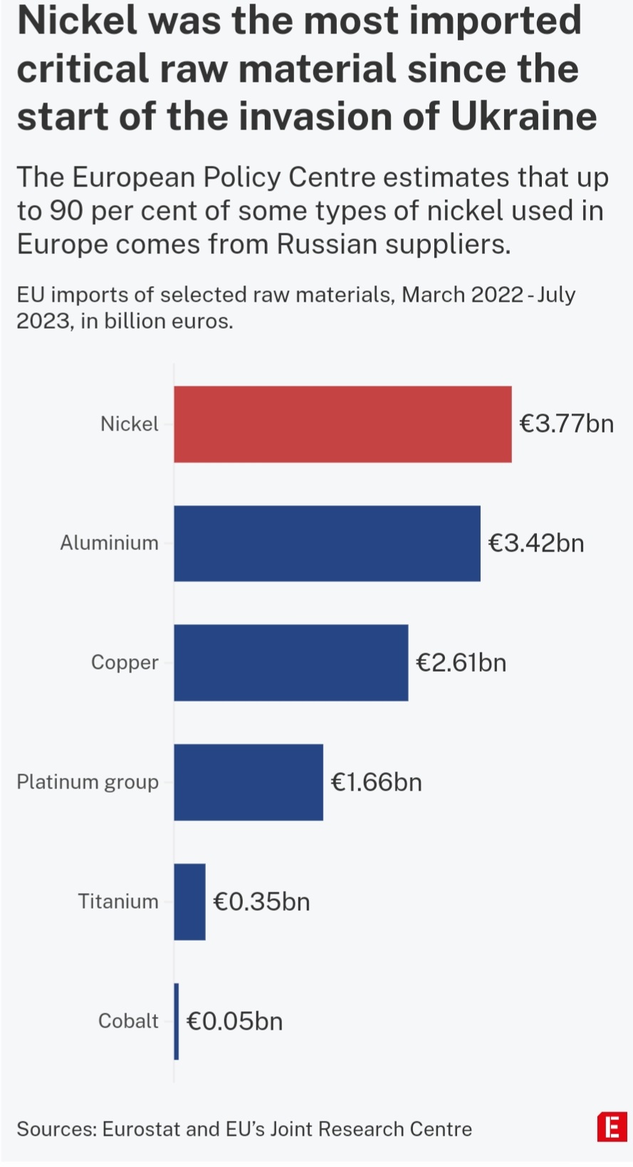Nornickel, the world leader in palladium and high-grade nickel, exported $7.6 billion worth of nickel and copper into the EU via Finnish and Swiss subsidiaries between the start of the war and July 2023. It also sent over $3 billion of palladium, platinum and rhodium into Zurich airport. In 2022, almost 50 per cent of Nornickel's sales went to Europe.
