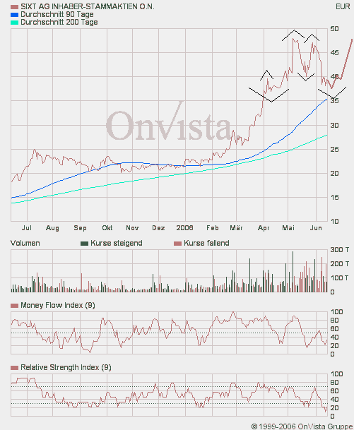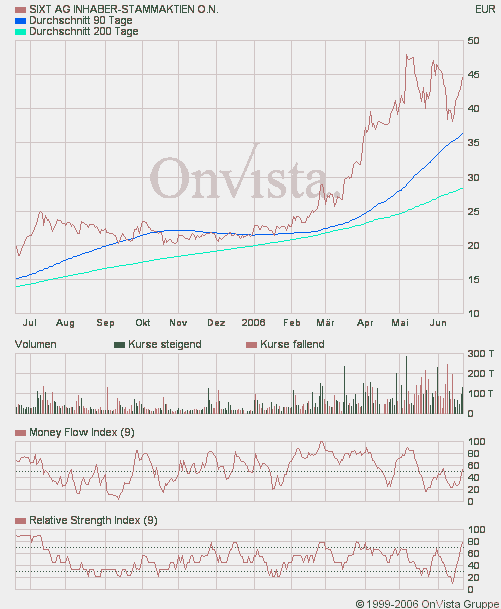 Rückblick: Die SIXT Aktie nutzte ihre gute Ausgangslage Anfang Juni 2006 nicht und fiel unter die kleine Unterstützung bei 43,13 zurück. Danach fiel die Aktie bis fast auf die Unterstützung bei 36,80 Euro zurück. Somit verharrte die Aktie in der Seitwärtsbewegung seit 05.05.2006, mit der die Aktie den starken Run von Januar 2006 bis Mai auskonsolidiert. Seit 13.06. zieht die Aktie wieder an und nähert sich nun langsam dem Jahreshoch bei 48,31 Euro.