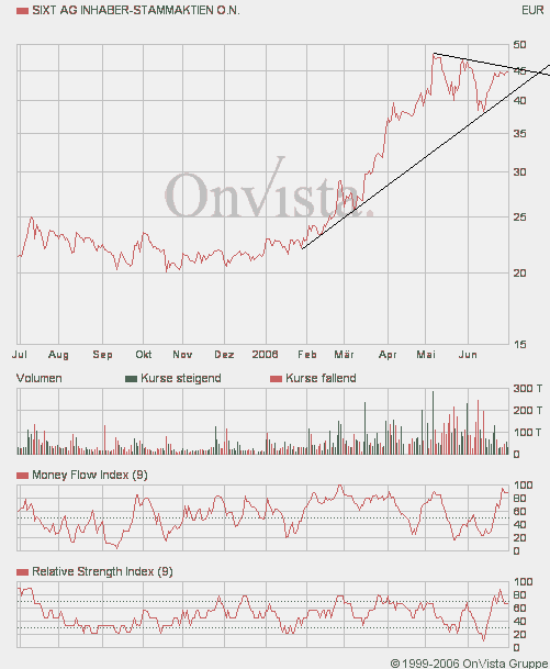 Rückblick: Die SIXT Aktie legte ab Ende Januar 2006 eine steile Rallye hin. Nach dem Ausbruch aus einer bullischen Flagge und über den primären Abwärtstrend stieg sie bis auf ein Hoch bei 48,31 Euro an. Von dort aus fiel die Aktie bis 36,80 Euro zurück. Dabei erreichte sie die überwundene obere Begrenzung der Aufwärtsbewegung seit Mai 2003 nicht ganz. In den letzten Wochen steig die Aktie wieder an und näherte sich wieder dem Hoch vom 05.05.2006 bei 48,31 Euro an. Knapp unterhalb dieser Marke konsolidiert die Aktie seit einigen Tagen.