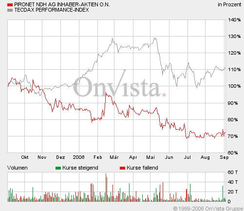 Pironet NDH ist für die Zukunft gut positioniert und optimistisch, die sich bietenden Potentiale auszuschöpfen. Die sehr hohen Investitionen in neue, innovative Produkte tragen bereits erste Früchte. Die Kundenresonanz ist erfreulich, die Ergebnisse weisen nach oben. Für das 2. Halbjahr geht der Vorstand daher davon aus, Umsatz und Ertrag gegenüber den ersten sechs Monaten auszubauen. Die Prognose für 2006 steht unverändert bei 42 Mio. EUR Umsatz und einer überproportionalen Ergebnisentwicklung. Mit dieser Aussage fühlen wir uns angesichts eines Auftragsbestands von rund 40 Mio. EUR auf der sicheren Seite. Der Bestand an liquiden Mitteln inklusive der zu Handelszwecken gehaltenen Wertpapiere von 27,3 Mio. EUR eröffnet uns zudem eine Vielzahl von Optionen, den Konsolidierungsprozess der Branche weiter aktiv voranzutreiben.